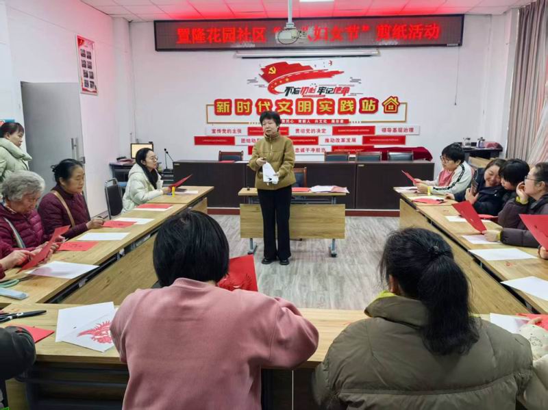 在妇女节这天,洛阳市剪纸艺术研究会在置隆花园社区开展了“三八妇女节”剪纸活动,与社区居民一起共庆佳节。